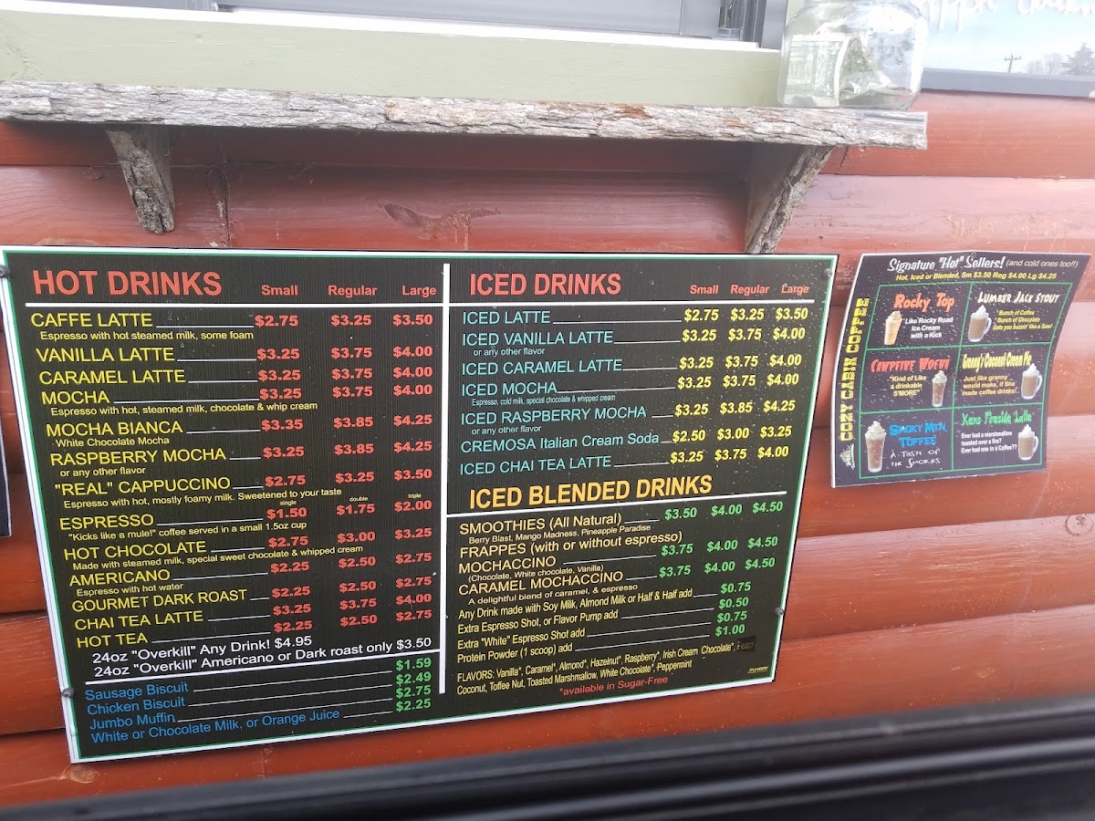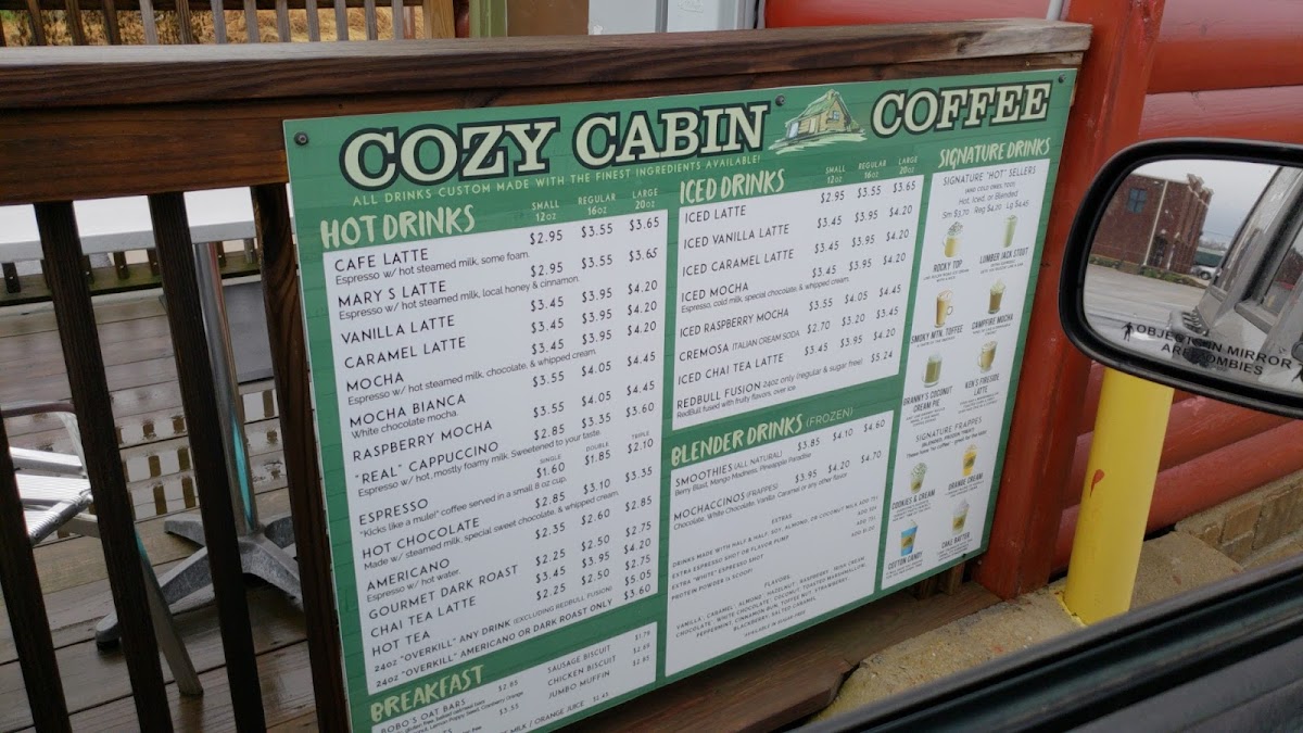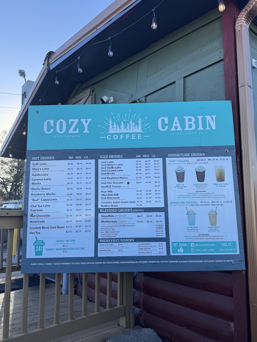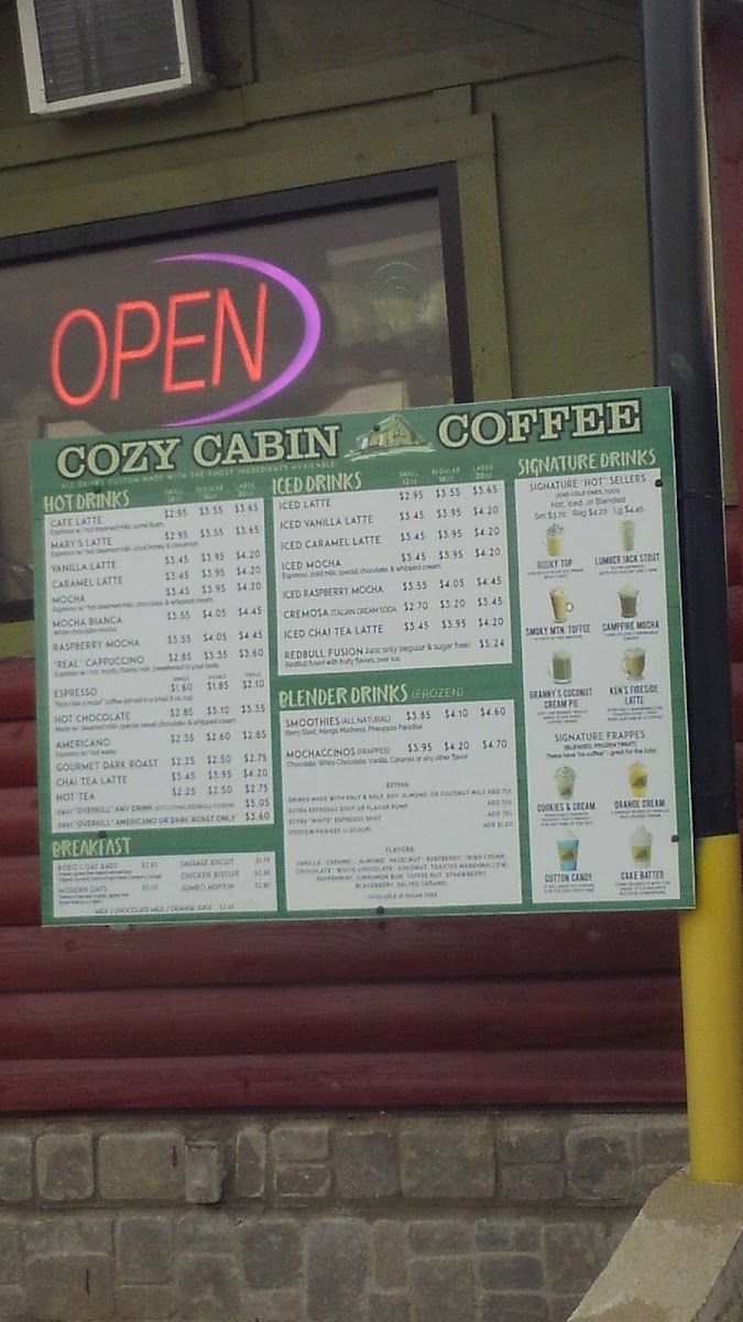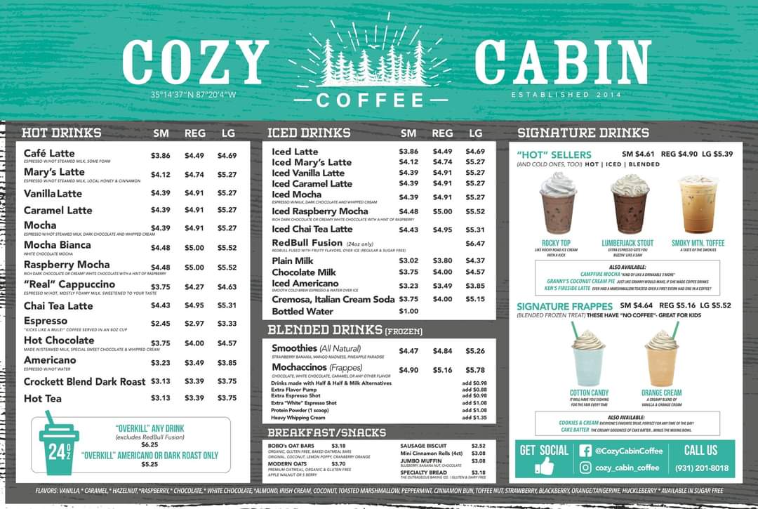 From a reviewer’s perspective, the menu at Cozy Cabin Coffee (616 N Locust Ave, Lawrenceburg, TN 38464, United States) feels like a thoughtful wrap-up of everything you’d want from a cozy neighborhood coffee stop. The Hot Drinks selection sets a comforting tone with classics like Cafe Latte, Mary S Latte, Vanilla Latte, Caramel Latte, and Mocha, while the Iced Drinks-including Iced Latte, Iced Vanilla Latte, Iced Caramel Latte, Iced Mocha, and Iced Raspberry Mocha-add refreshing balance for warmer days. Breakfast is simple but satisfying, highlighted by Bobo's Oat Bak, Sausage Biscuit, Chicken Biscuit, and a hearty Jumbo Muffin, which also appears among the Breakfast/Snacks alongside Bobo's Oat Bars, Modern Oats, Mini Cinnamon Rolls, and another Sausage Biscuit option for quick bites. For those craving something fun, the Signature Frappes like Cotton Candy and Orange Cream bring playful sweetness, while Blender Drinks such as Smoothies and Mochaccinos round out the menu with variety. Finally, the Others category-featuring Cotton Candy, Orange Cream, Lumberjack Stout, Amel Latte, and Pberry Mocha-adds unique twists that leave a memorable impression. Altogether, the menu feels cohesive and welcoming, making Cozy Cabin Coffee a well-rounded stop for both everyday coffee lovers and curious first-time visitors.