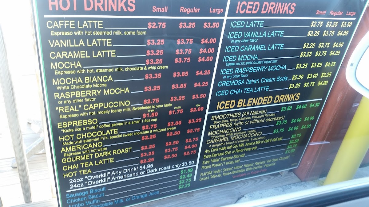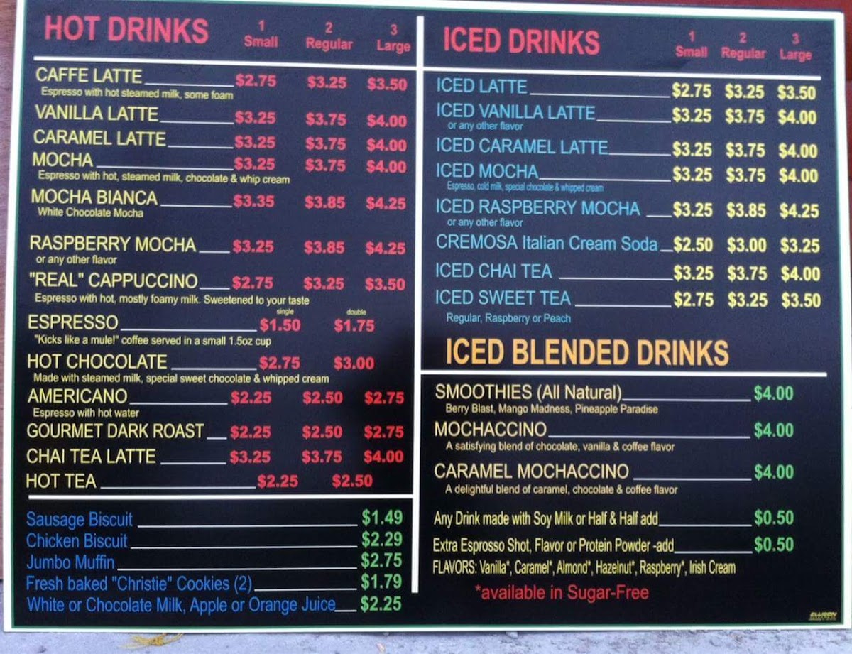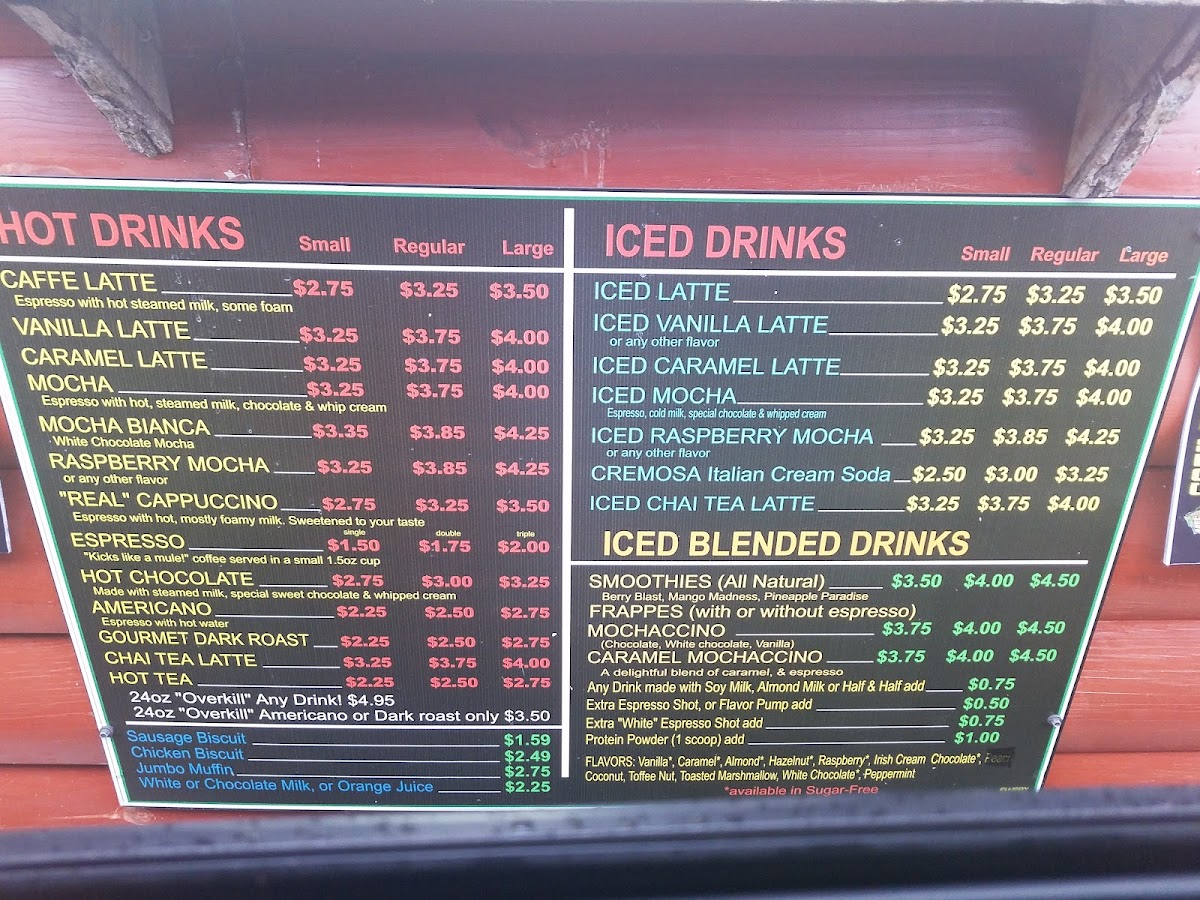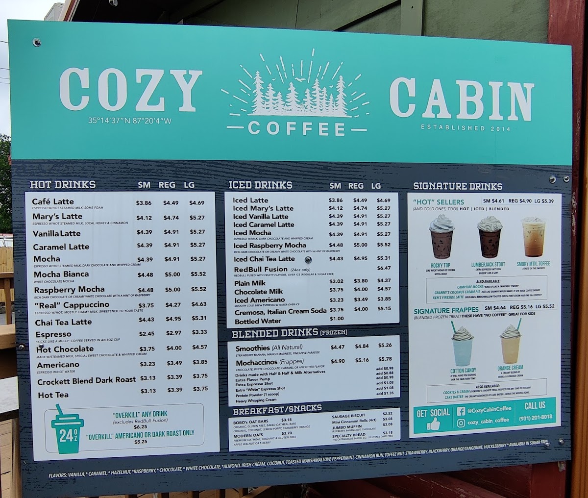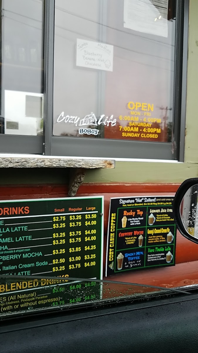 From a reviewer’s perspective, the menu at Cozy Cabin Coffee (616 N Locust Ave, Lawrenceburg, TN 38464, United States) feels like a thoughtful wrap-up of everything you’d want from a cozy neighborhood coffee stop. The Hot Drinks selection sets a comforting tone with classics like Cafe Latte, Mary S Latte, Vanilla Latte, Caramel Latte, and Mocha, while the Iced Drinks-including Iced Latte, Iced Vanilla Latte, Iced Caramel Latte, Iced Mocha, and Iced Raspberry Mocha-add refreshing balance for warmer days. Breakfast is simple but satisfying, highlighted by Bobo's Oat Bak, Sausage Biscuit, Chicken Biscuit, and a hearty Jumbo Muffin, which also appears among the Breakfast/Snacks alongside Bobo's Oat Bars, Modern Oats, Mini Cinnamon Rolls, and another Sausage Biscuit option for quick bites. For those craving something fun, the Signature Frappes like Cotton Candy and Orange Cream bring playful sweetness, while Blender Drinks such as Smoothies and Mochaccinos round out the menu with variety. Finally, the Others category-featuring Cotton Candy, Orange Cream, Lumberjack Stout, Amel Latte, and Pberry Mocha-adds unique twists that leave a memorable impression. Altogether, the menu feels cohesive and welcoming, making Cozy Cabin Coffee a well-rounded stop for both everyday coffee lovers and curious first-time visitors.